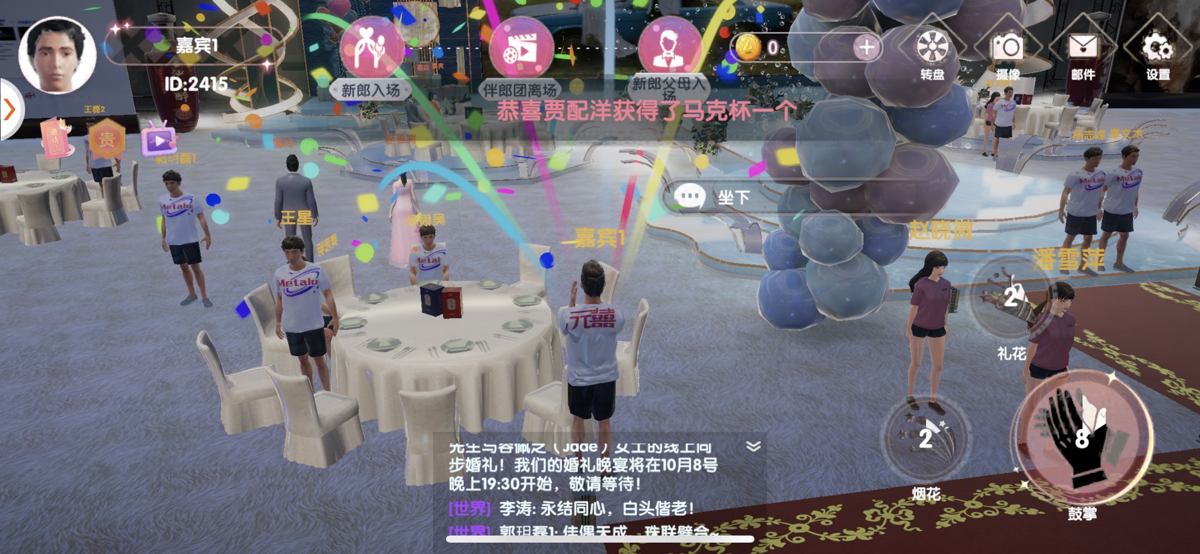 《MetaLove元囍》從“人文傳承+傳統(tǒng)婚禮+科技技術(shù)”角度出發(fā),圍繞人機(jī)交互、人人交互打造虛實(shí)結(jié)合社交互動(dòng)系統(tǒng),旨在提升用戶的參與感和體驗(yàn)感。一方面,虛擬空間中的人物具備行為動(dòng)作、功能動(dòng)作、交互動(dòng)作,可通過(guò)“鼓掌、放煙花、放禮花”等方式,為新人捧場(chǎng);另一方面,虛擬形象成為個(gè)人在線上進(jìn)行表達(dá)的重要窗口,用戶通過(guò)聊天頻道進(jìn)行文字溝通,從而實(shí)現(xiàn)陌生人社交的功能,快速建立與他人的聯(lián)系。